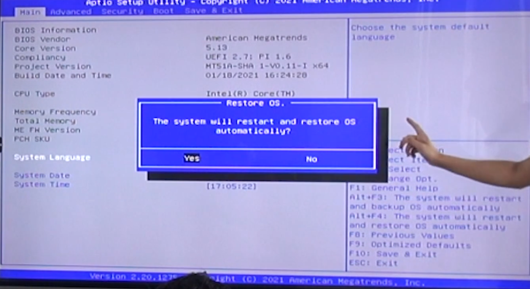 « 系统还原 希沃一体机 熊猫老师 发布于 2025-12-25 08:18 阅读:20 1.开机按F2 进入bios设置 2.打开back备份还原开关。按f10保存。 3.重启电脑,再按f2进入bios,alt+f4 恢复出厂系统 选择yes 回车 ,重启恢复。
